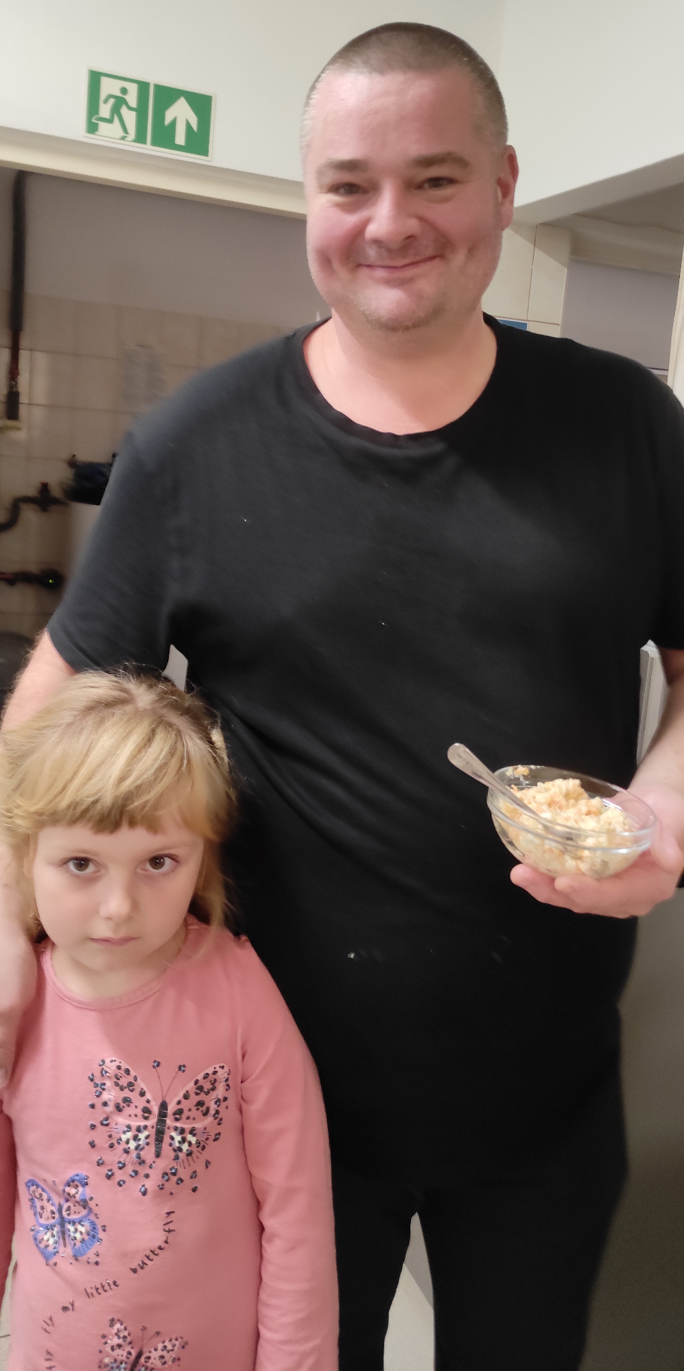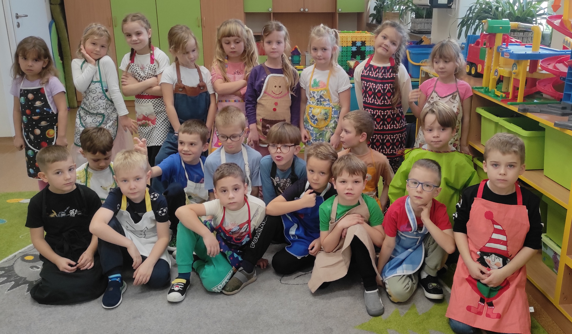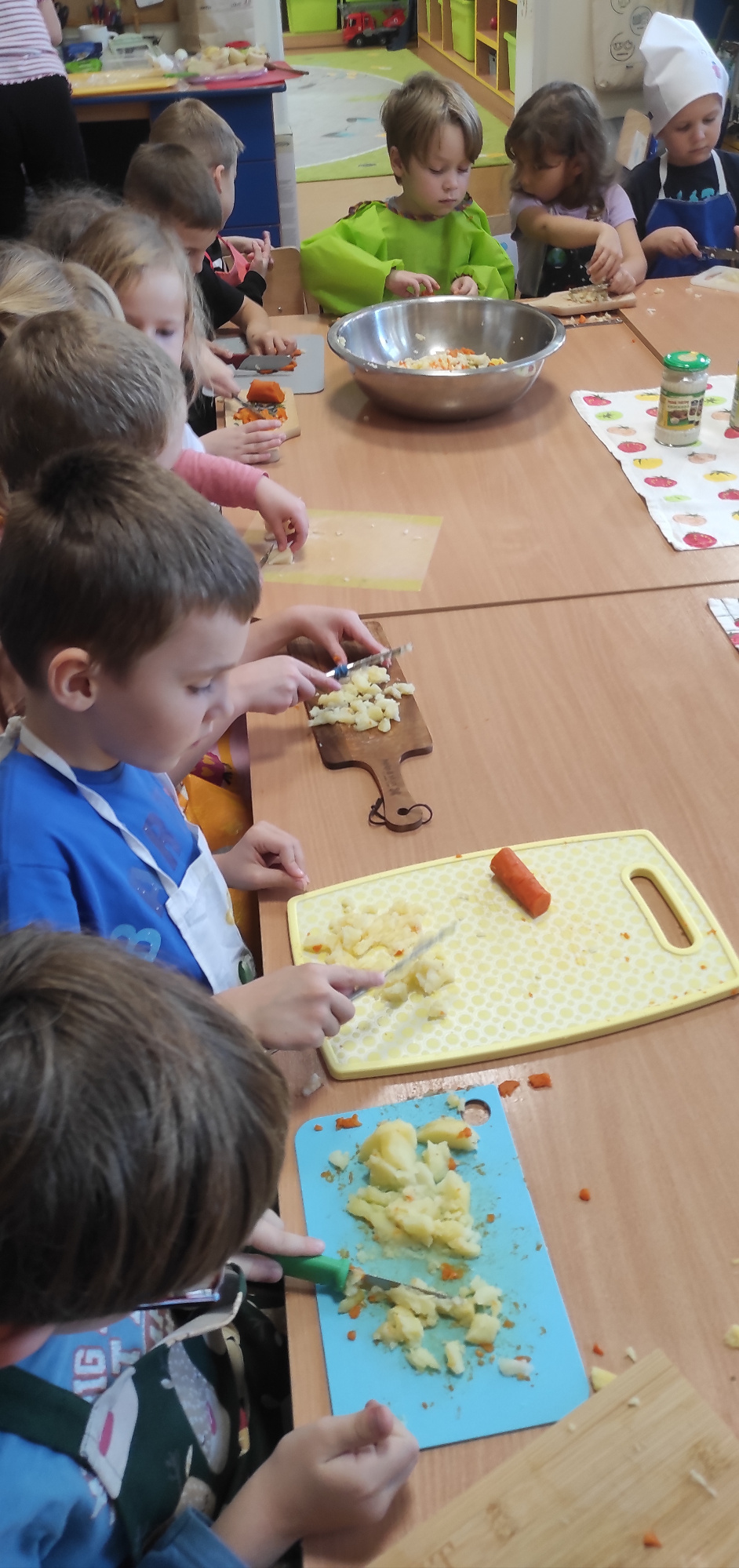 Każdy przedszkolak miał swoje zadanie: obieranie, krojenie, mieszanie czy doprawianie. Wspólnym wysiłkiem, cierpliwością i współpracą powstała pyszna, zdrowa i kolorowa – tradycyjna sałatka jarzynowa, która zachwycała nie tylko smakiem, ale i zapachem. Dzieci pracowały z ogromnym zaangażowaniem, a przy tym uczyły się współdziałania, cierpliwości oraz zasad bezpiecznego posługiwania się przyborami kuchennymi.