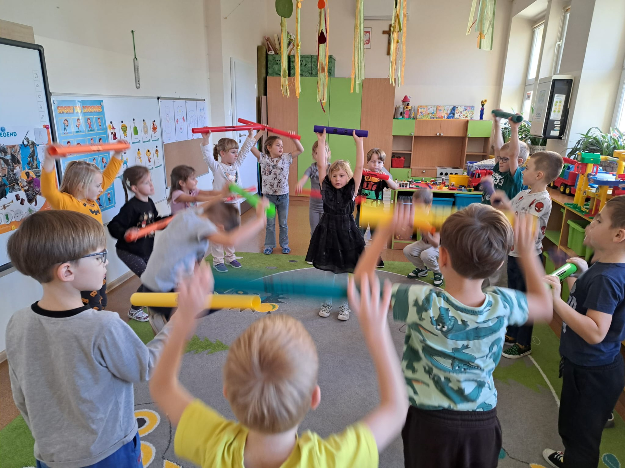 Zajęcia ruchowe przy muzyce to jedna z ulubionych aktywności naszych „Jeżyków”. Tym razem dzieci miały okazję uczestniczyć w niezwykle ciekawych zajęciach z wykorzystaniem Bum Bum Rurek – kolorowych, plastikowych rurek, które po uderzeniu o stół, dłoń, podłogę lub o siebie nawzajem wydają dźwięki o różnej wysokości.
