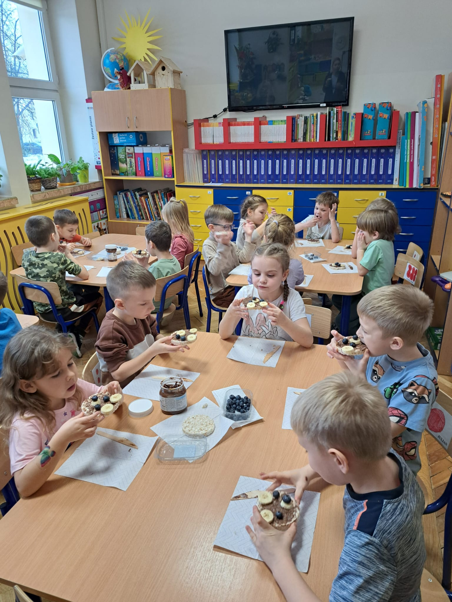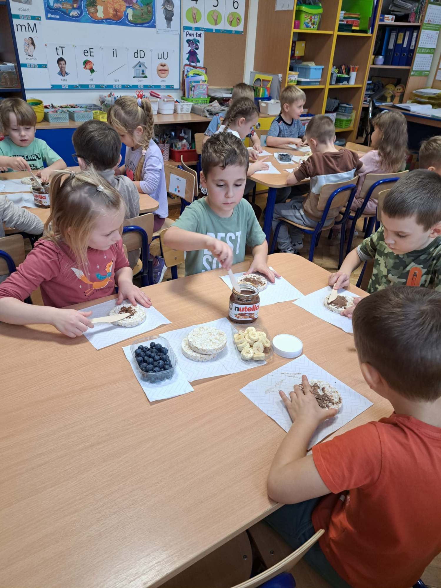 W naszej grupie ten dzień upłynął w wyjątkowo radosnej i twórczej atmosferze. Zorganizowaliśmy zajęcia sensoryczne, podczas których dzieci przygotowywały „misiowe kanapki”. Przedszkolaki z ogromnym zaangażowaniem badały zapachy, faktury i smaki produktów. Samodzielnie smarowały pieczywo kremem i układały na nim plasterki banana oraz borówki, ćwicząc przy tym sprawność manualną i koordynację ruchową.