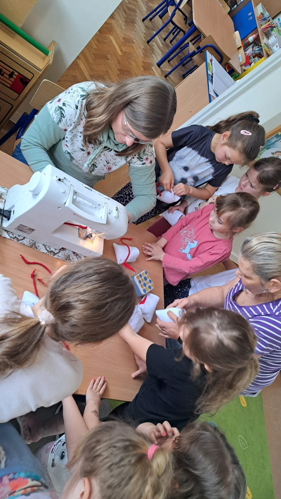 Dzieci krok po kroku poznawały technikę wykonania pracy – dowiedziały się, jakie materiały i przybory są potrzebne do szycia, jak należy się nimi posługiwać oraz na czym polega praca krawcowej. Dużym zainteresowaniem cieszyła się również prezentacja działania maszyny do szycia, która dla wielu przedszkolaków była zupełnie nowym i fascynującym doświadczeniem.